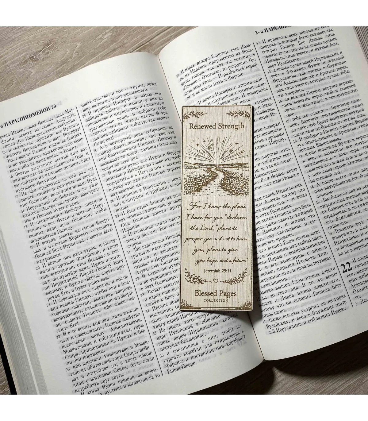 This elegant wooden bookmark features the beloved Bible verse Jeremiah 29:11, engraved alongside a peaceful landscape where a winding path leads toward a radiant sunrise. The design symbolizes faith, guidance, and the promise of a hopeful future.