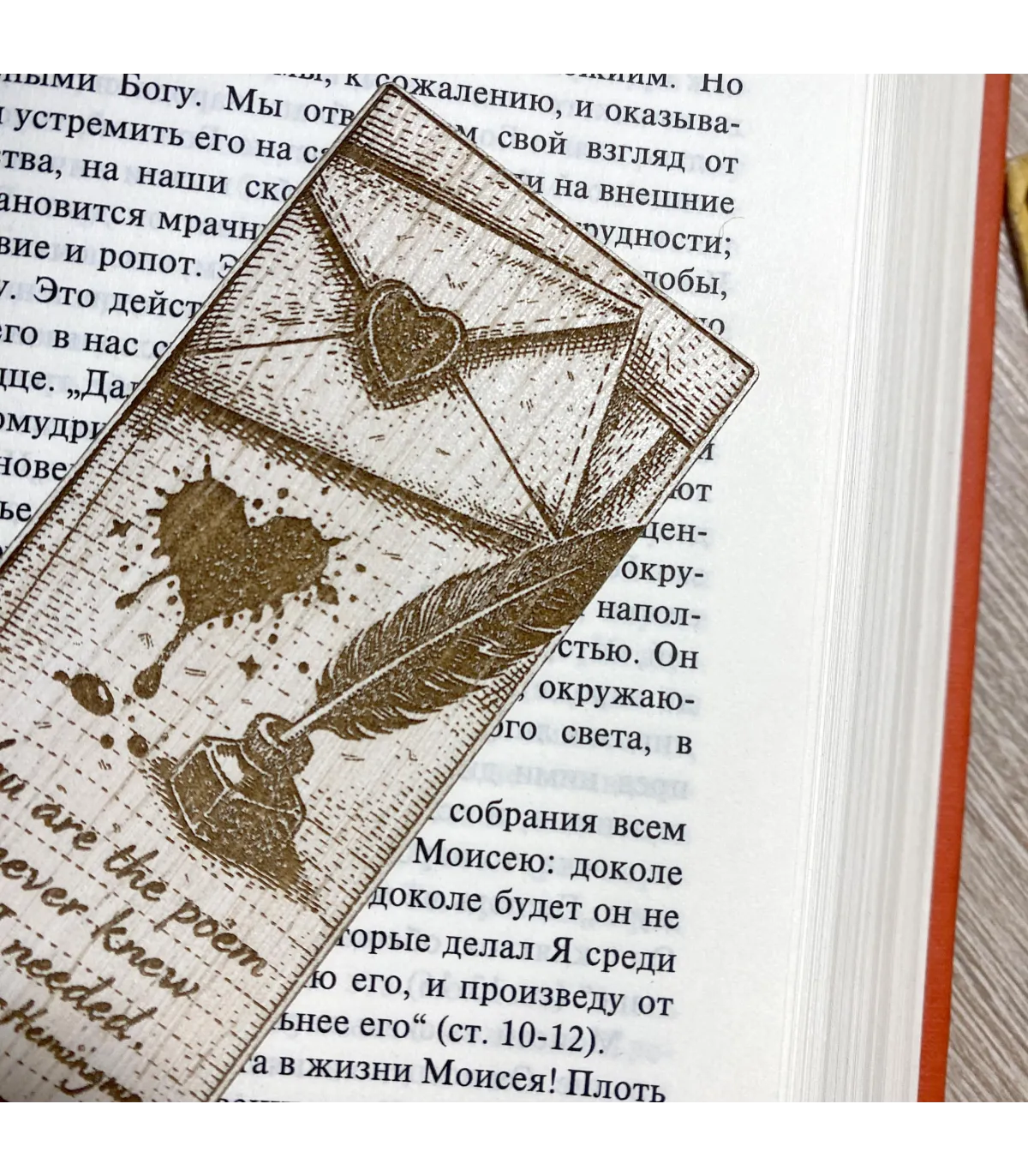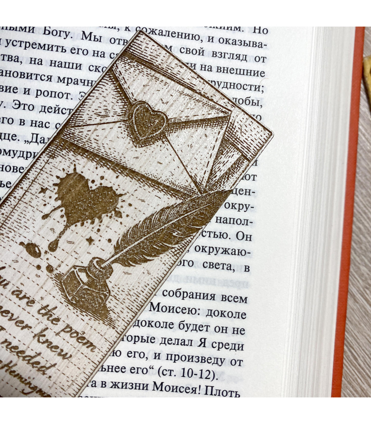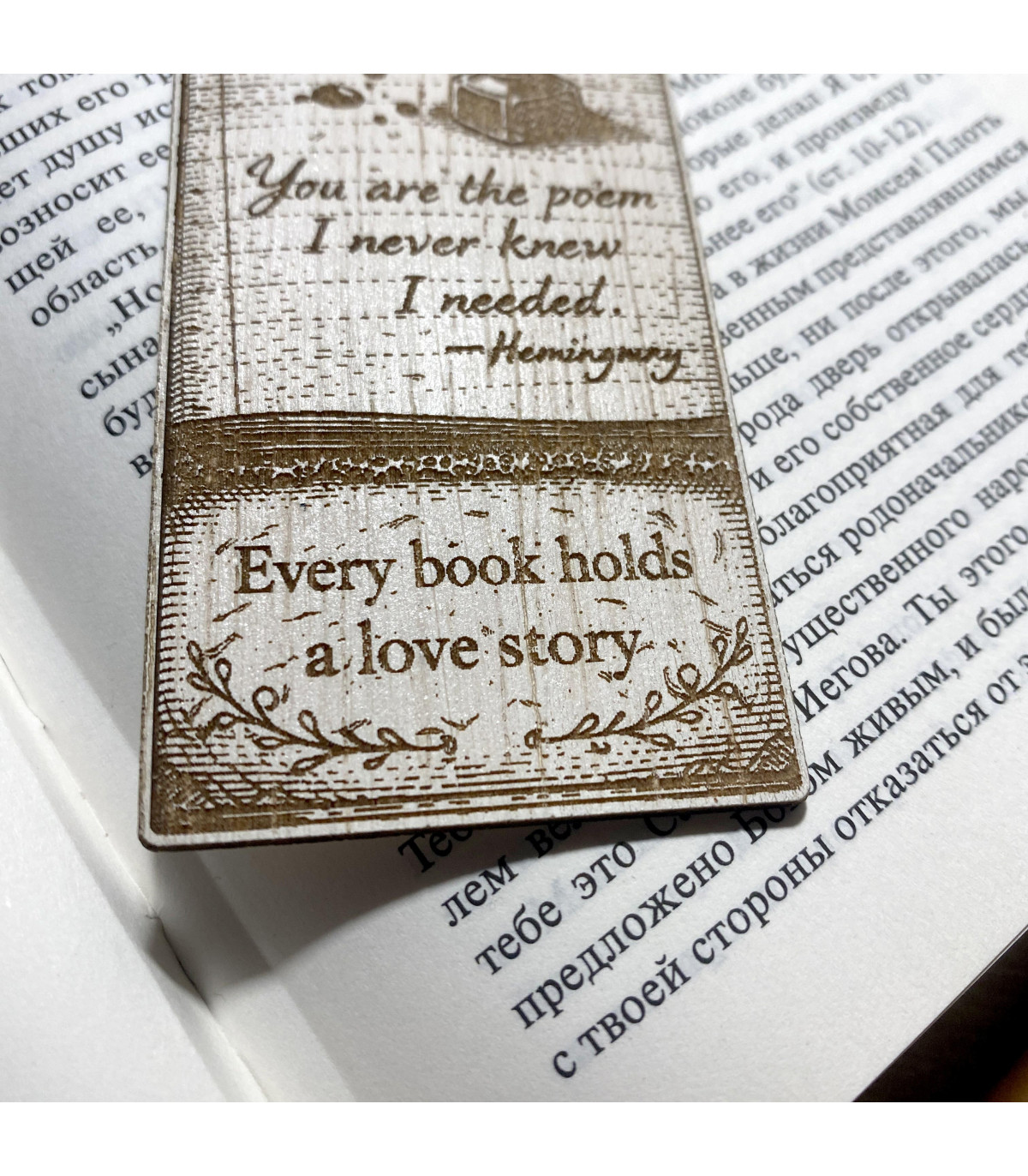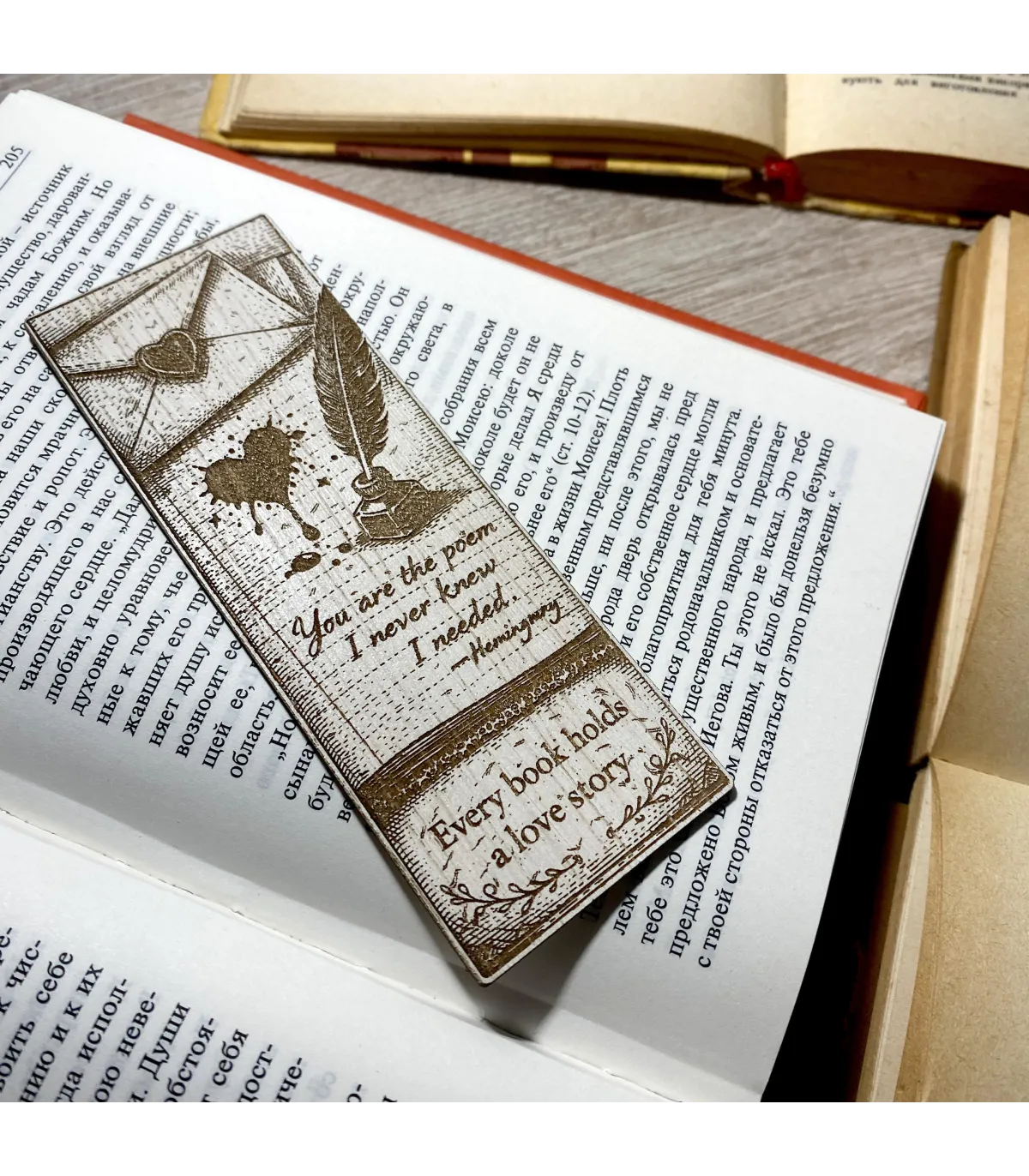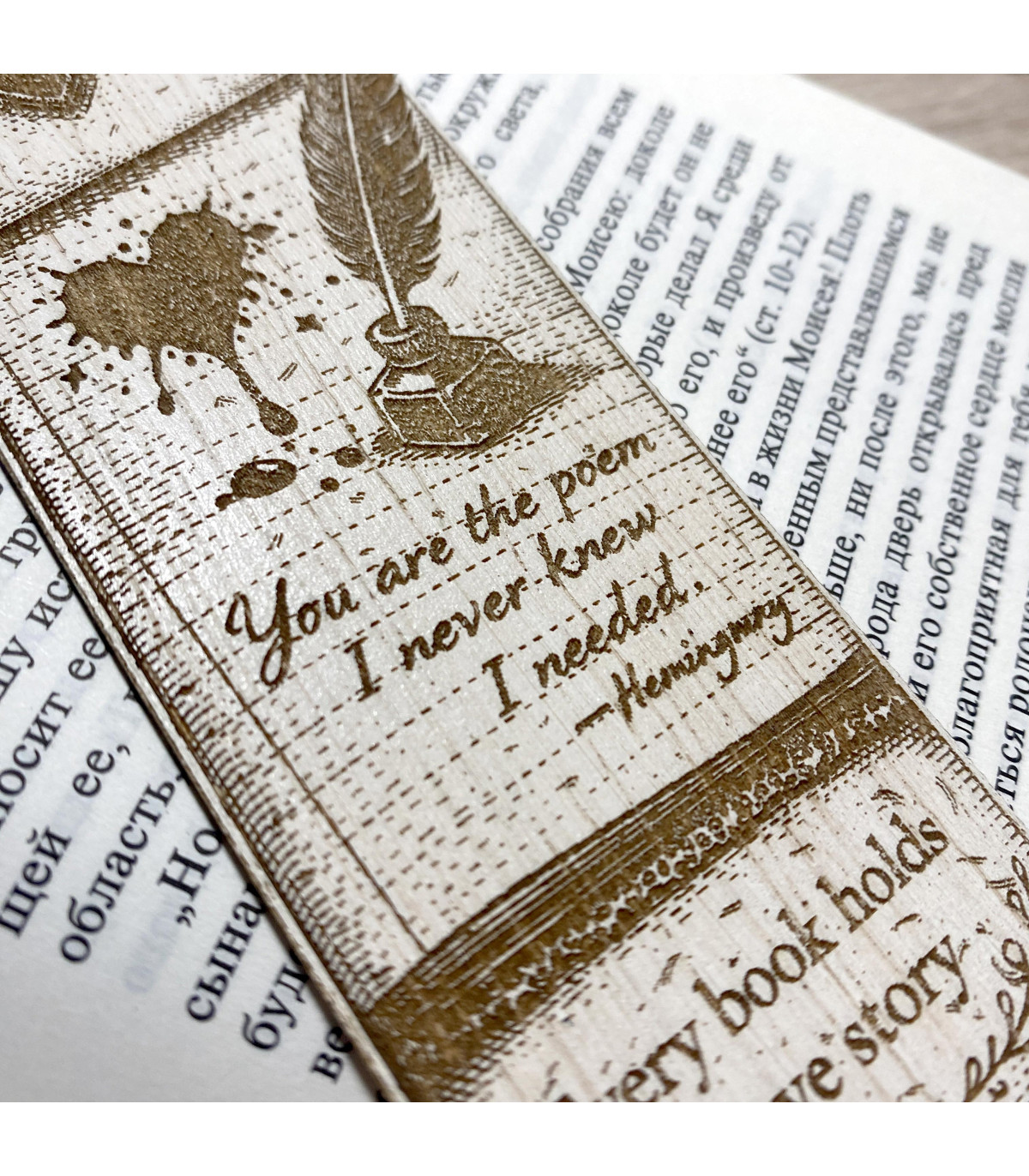 This elegant wooden bookmark features a romantic literary quote inspired by Ernest Hemingway, surrounded by beautiful vintage writing elements that capture the quiet magic of poetry, letters, and timeless stories.