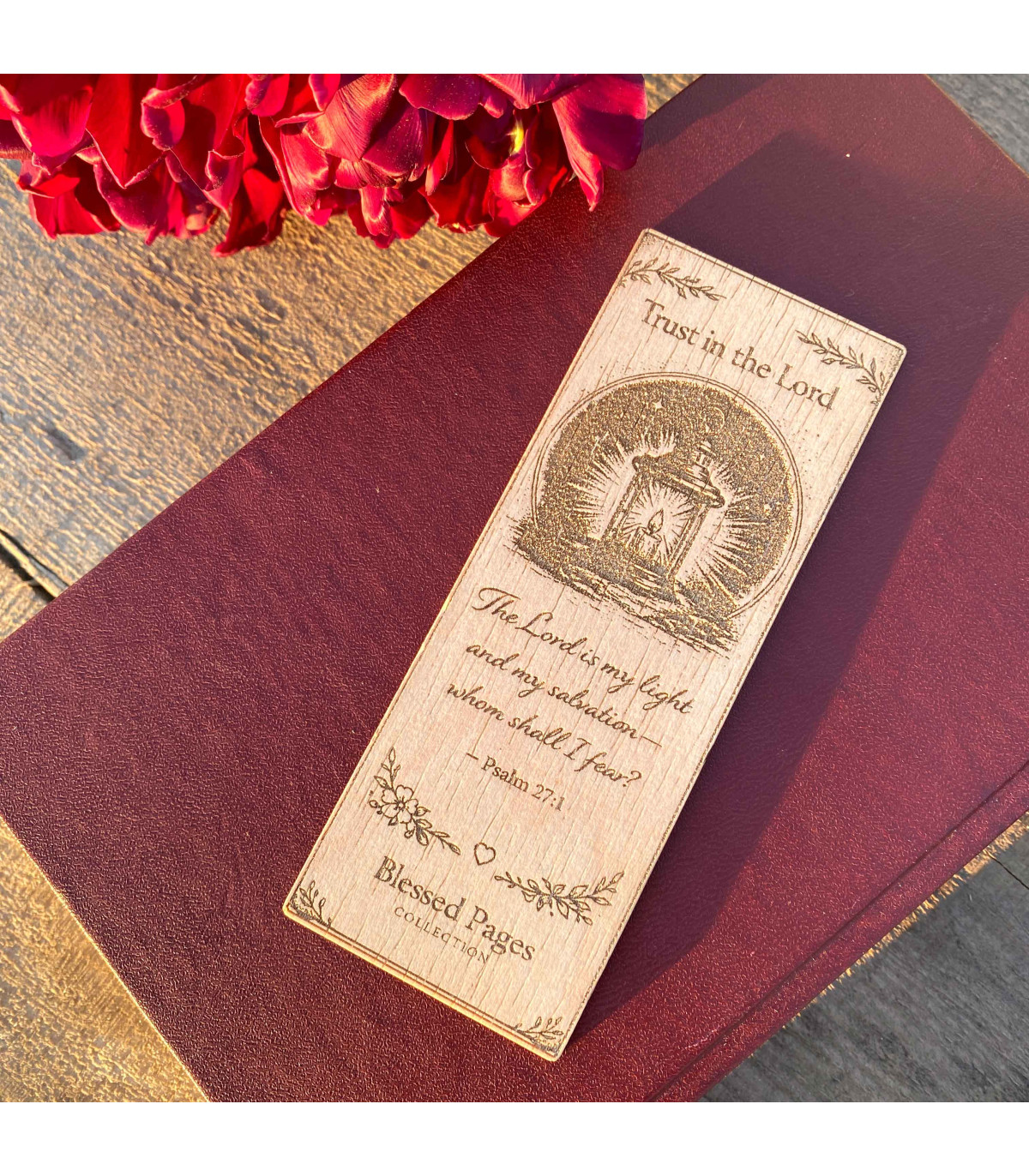 This wooden bookmark features the powerful Bible verse Psalm 27:1, beautifully laser engraved with an elegant lantern glowing with radiant light. The lantern symbolizes God’s guidance through darkness, offering hope, courage, and unwavering faith.