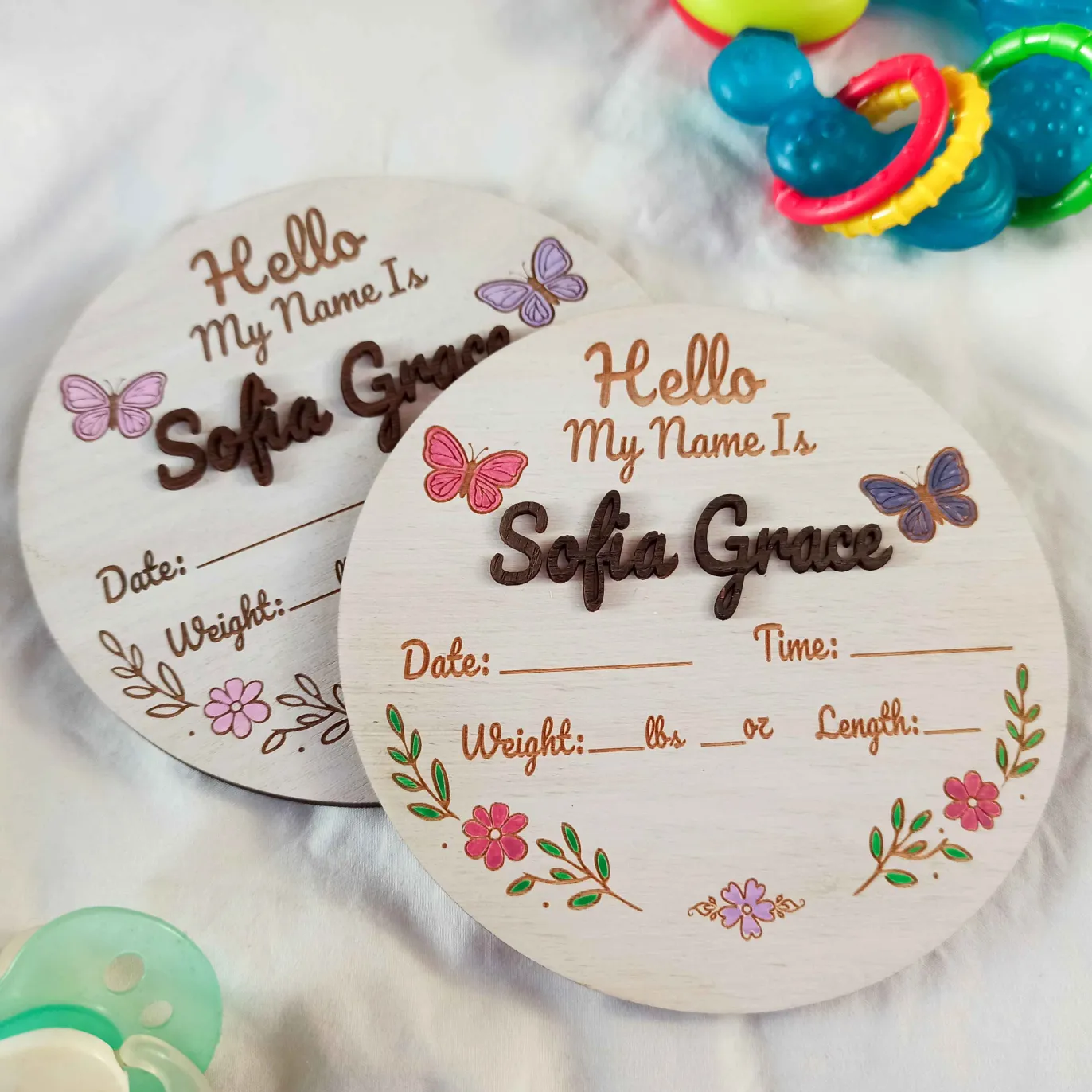 Capture your baby’s first moments with this custom wooden birth announcement sign.