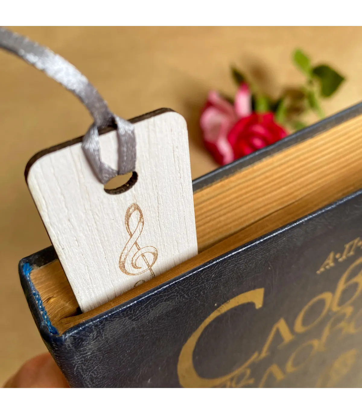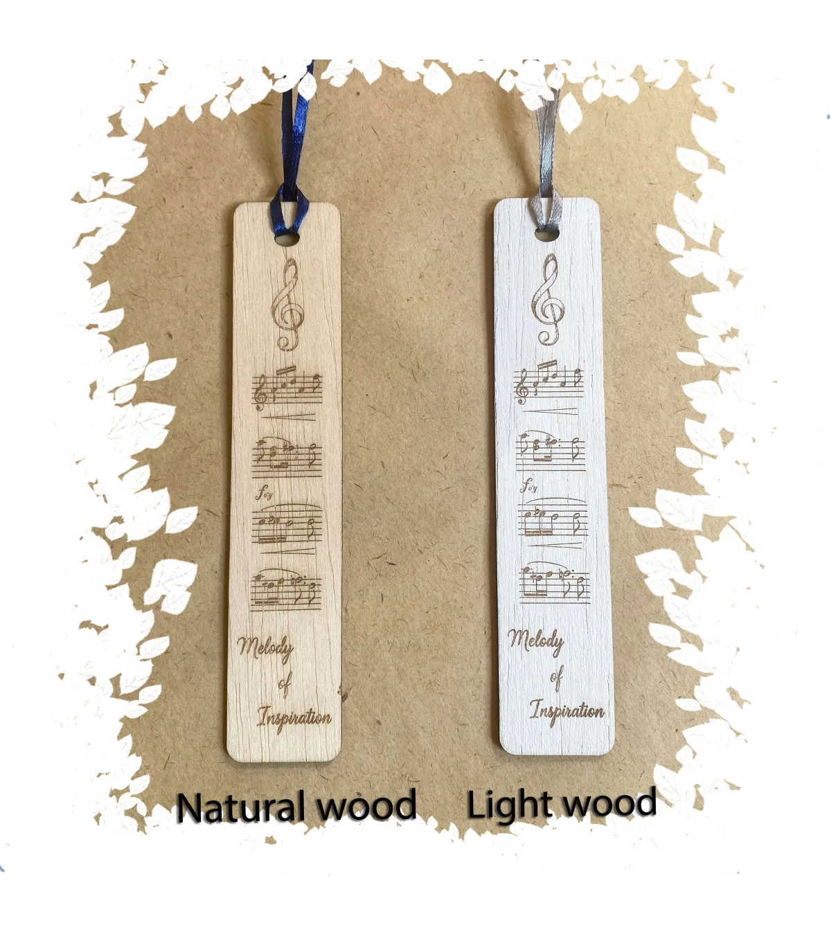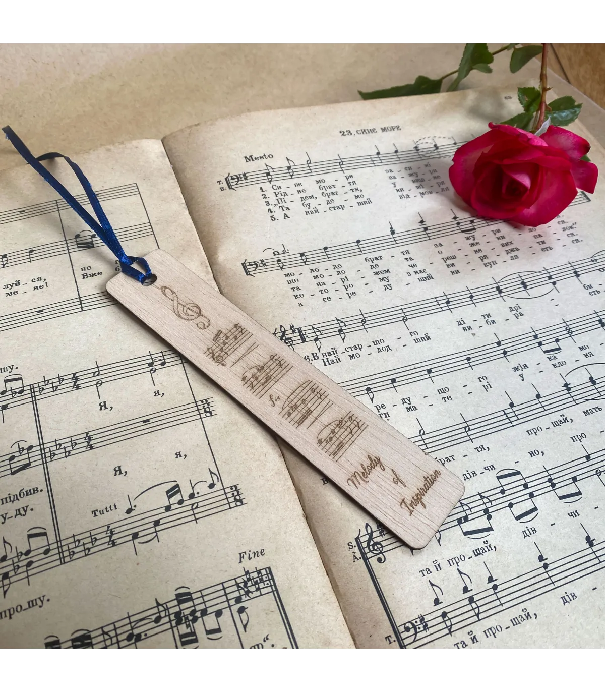 Ця оригінальна закладка виготовлена з натурального дерева та прикрашена лазерним гравіюванням у вигляді нотного стану, скрипкового ключа та надпису «Melody of Inspiration».
