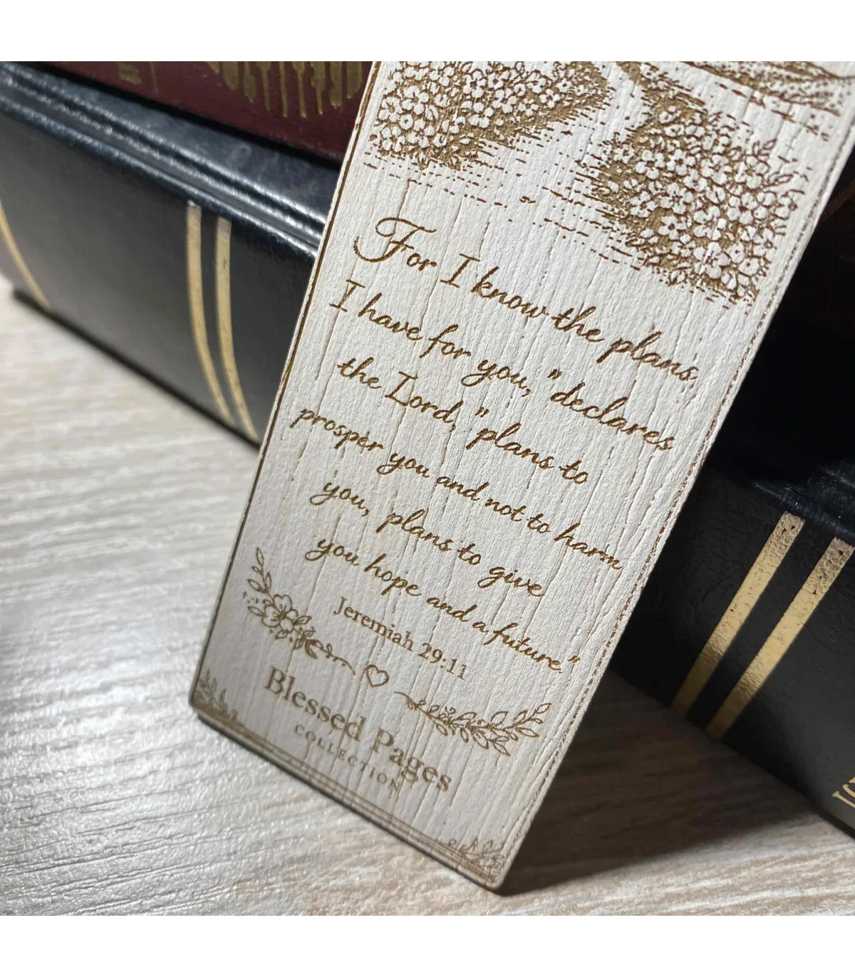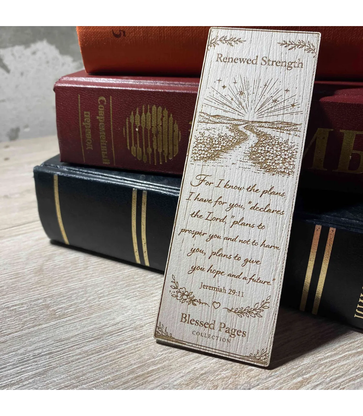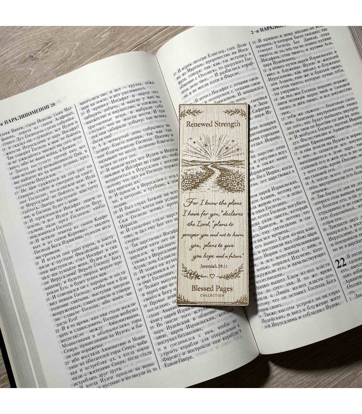 Ця елегантна дерев'яна закладка містить улюблений біблійний вірш з Єремії 29:11, вигравіруваний поруч із мирним пейзажем, де звивиста стежка веде до сяючого сходу сонця. Дизайн символізує віру, керівництво та обіцянку сповненого надій майбутнього.