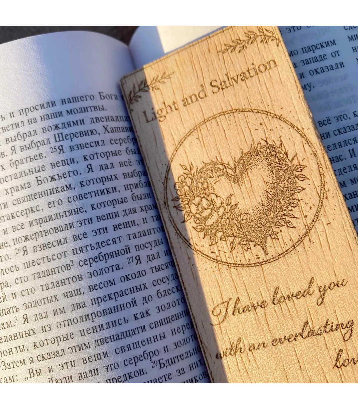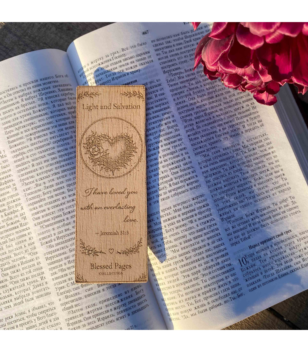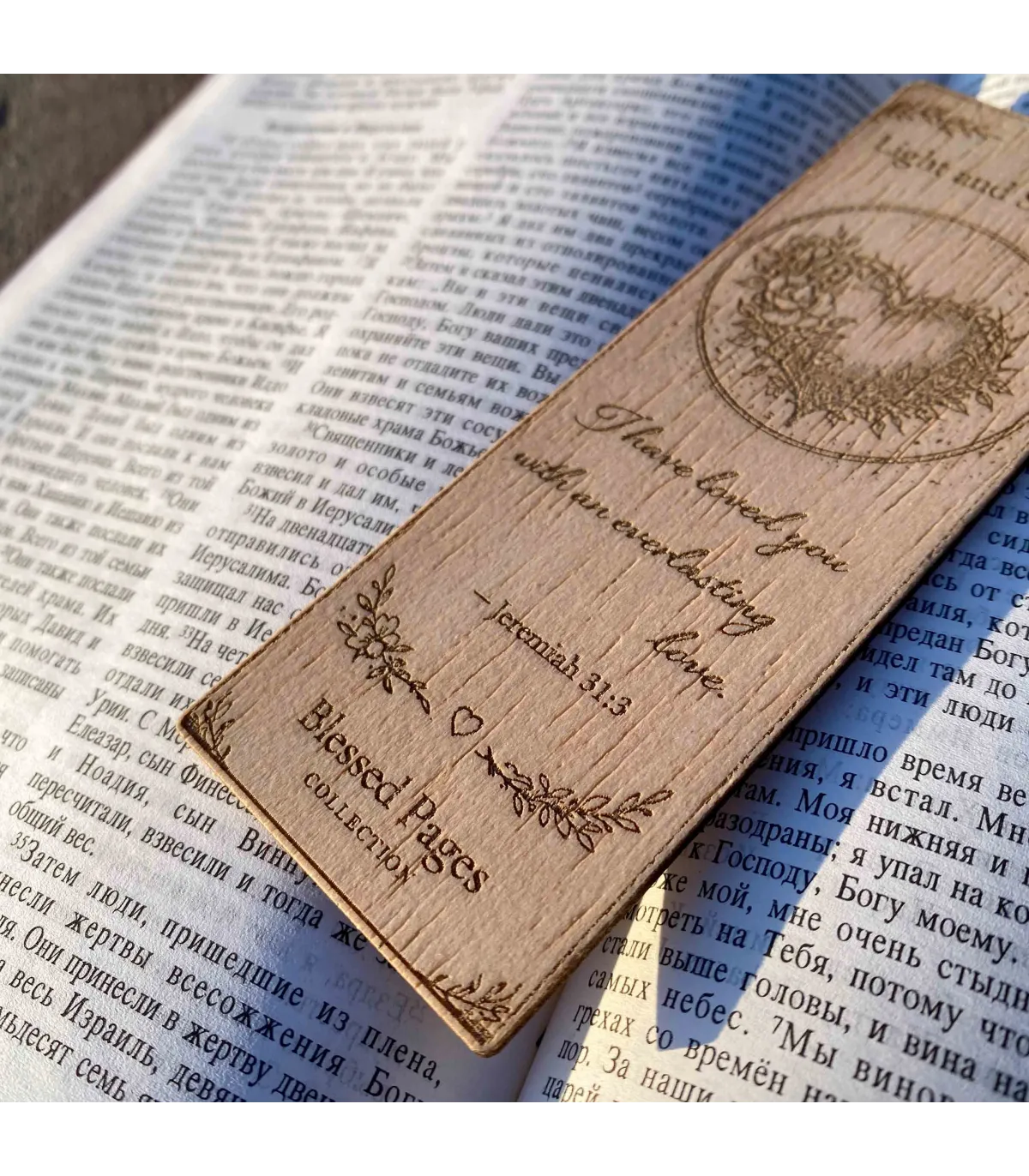 Ця дерев'яна закладка містить втішний біблійний вірш з Єремії 31:3, делікатно вигравіруване серце, сформоване з ніжних квітів. Дизайн символізує любов, яка є тривалою, вірною та вкоріненою в Божих обітницях.