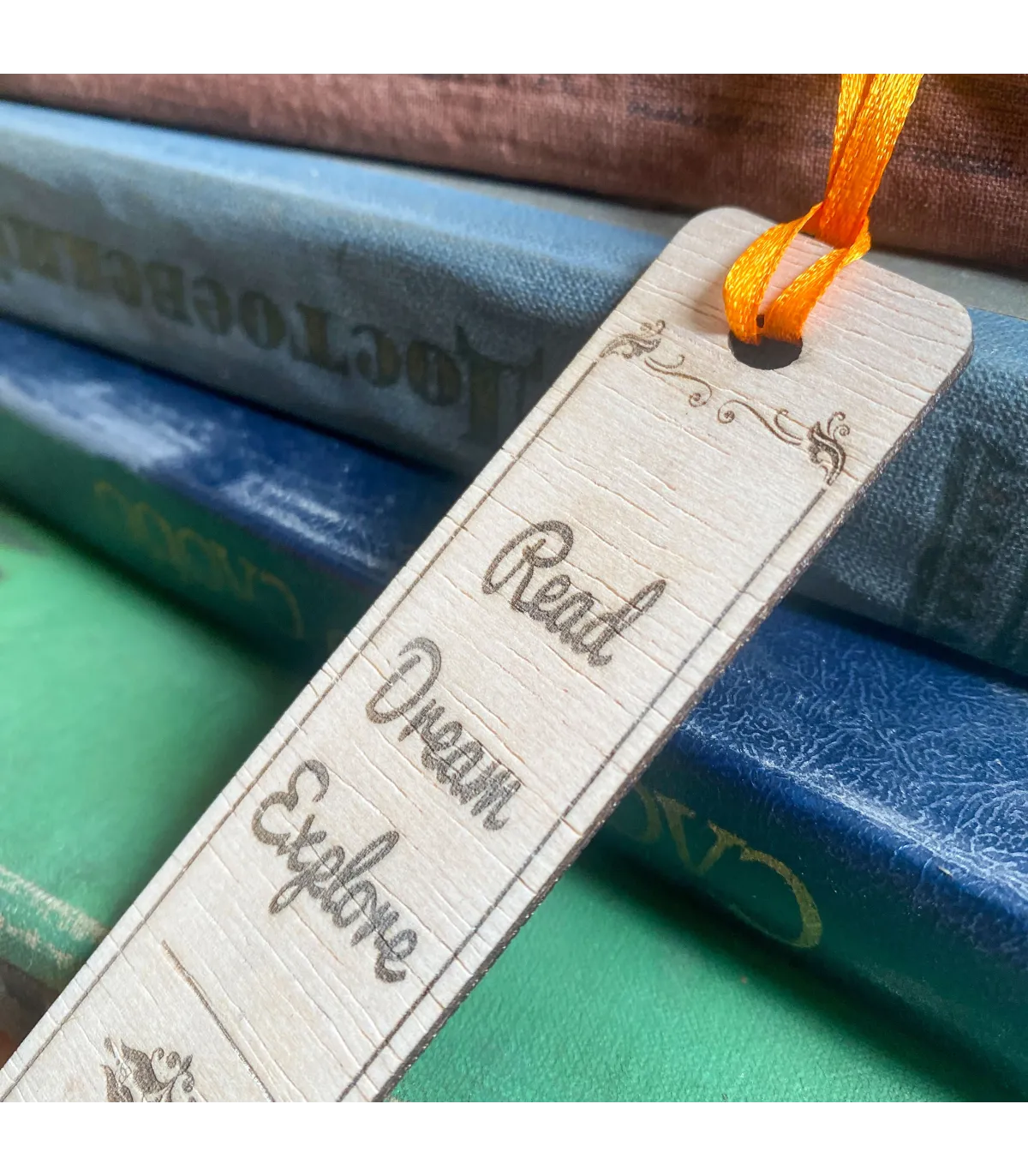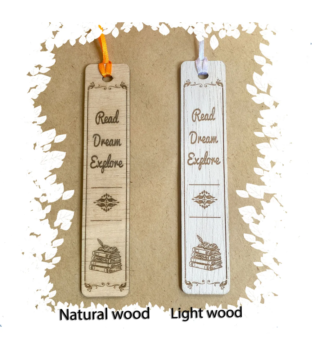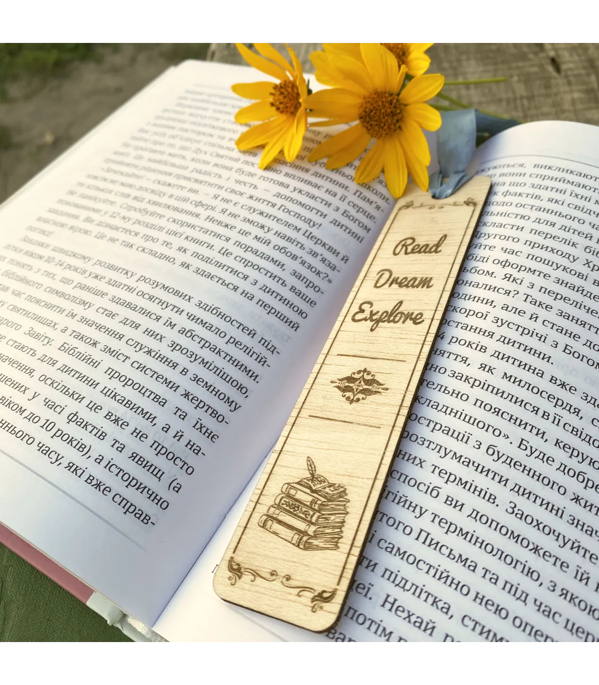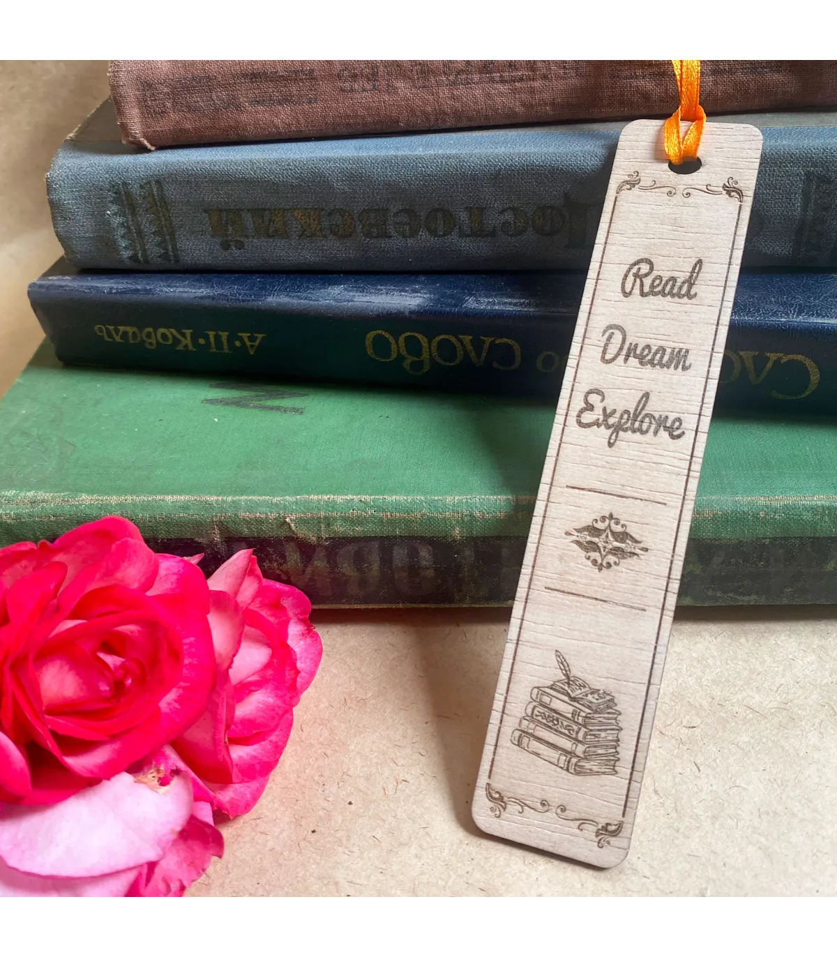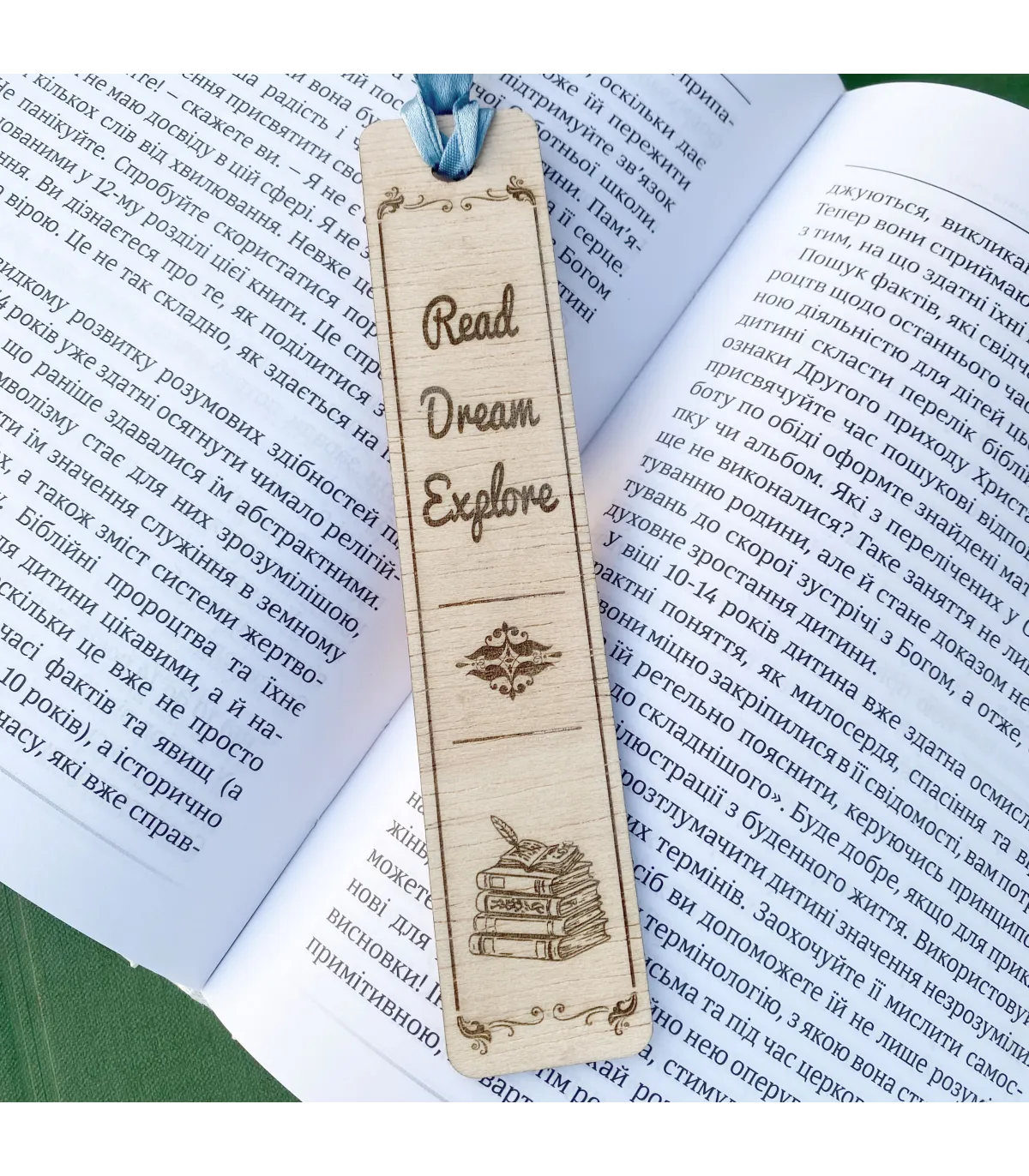 Ця стильна дерев’яна закладинка виготовлена з натурального дерева та прикрашена лазерним гравіюванням. На ній зображено натхненний напис “Read Dream Explore” та художнє зображення стопки книжок. Легка, міцна і приємна на дотик, закладинка стане чудовим подарунком для книголюбів, студентів, вчителів або будь-кого, хто цінує красу читання. Завдяки стрічці її зручно використовувати, а унікальний дизайн додає особливого шарму вашим улюбленим книгам.