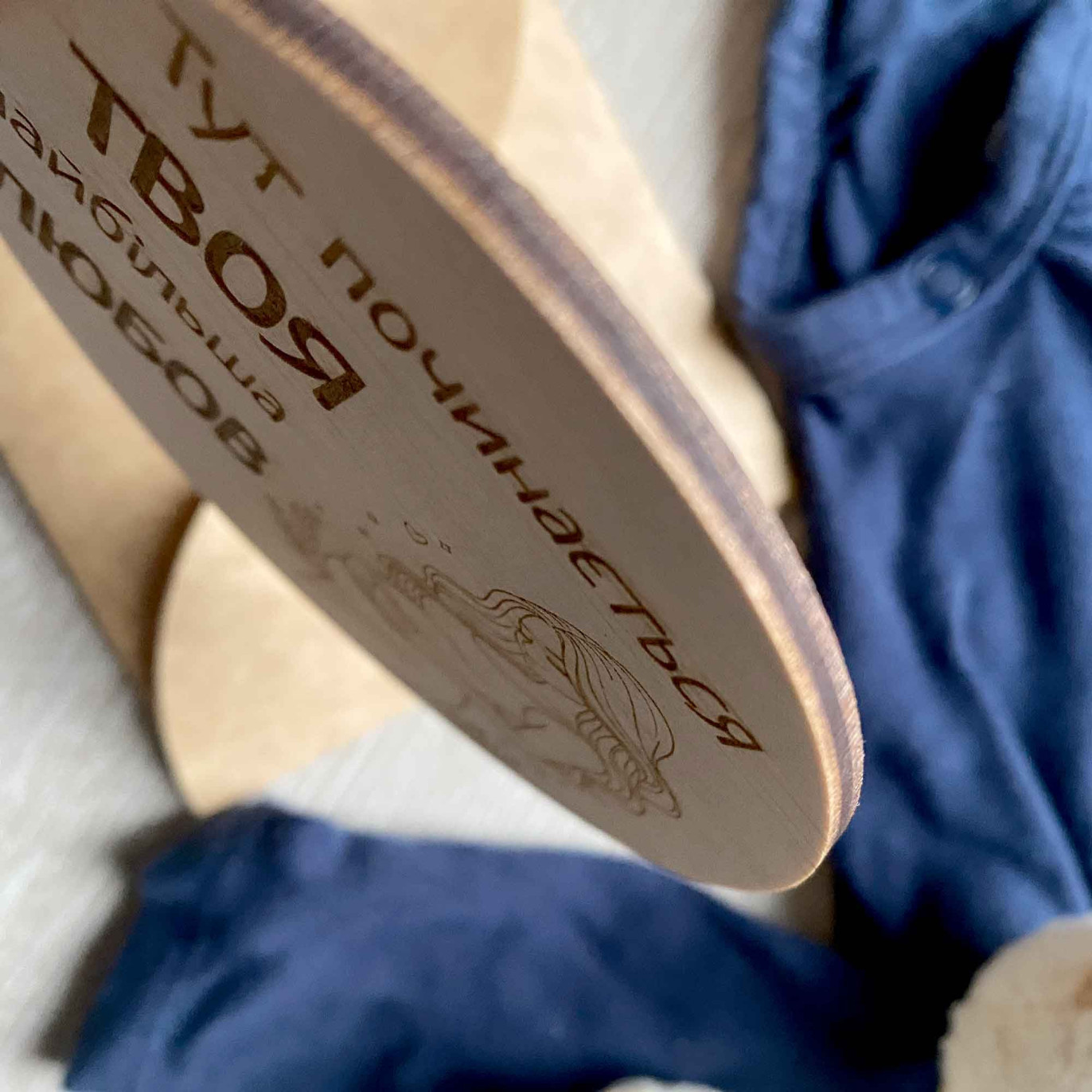 Дерев’яна табличка для оголошення вагітності — це особливий аксесуар для створення пам’ятних моментів. Виріб виготовлений із натурального дерева та прикрашений гравіюванням із ніжним зображенням вагітної жінки та написом “Тут починається твоя найбільша любов”.