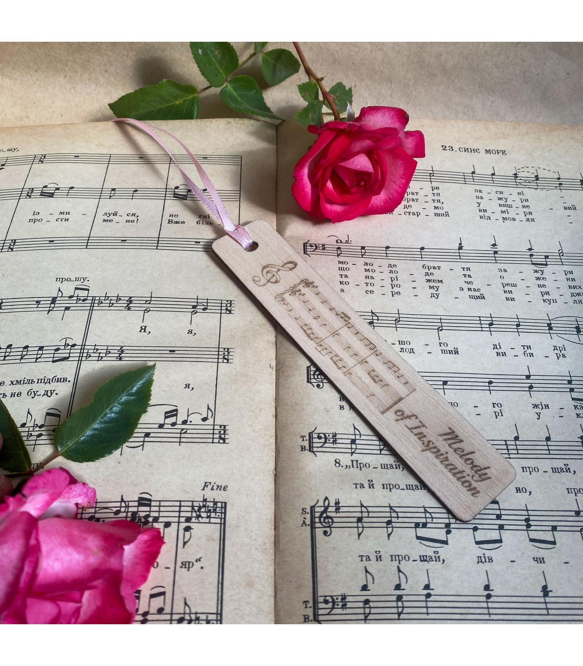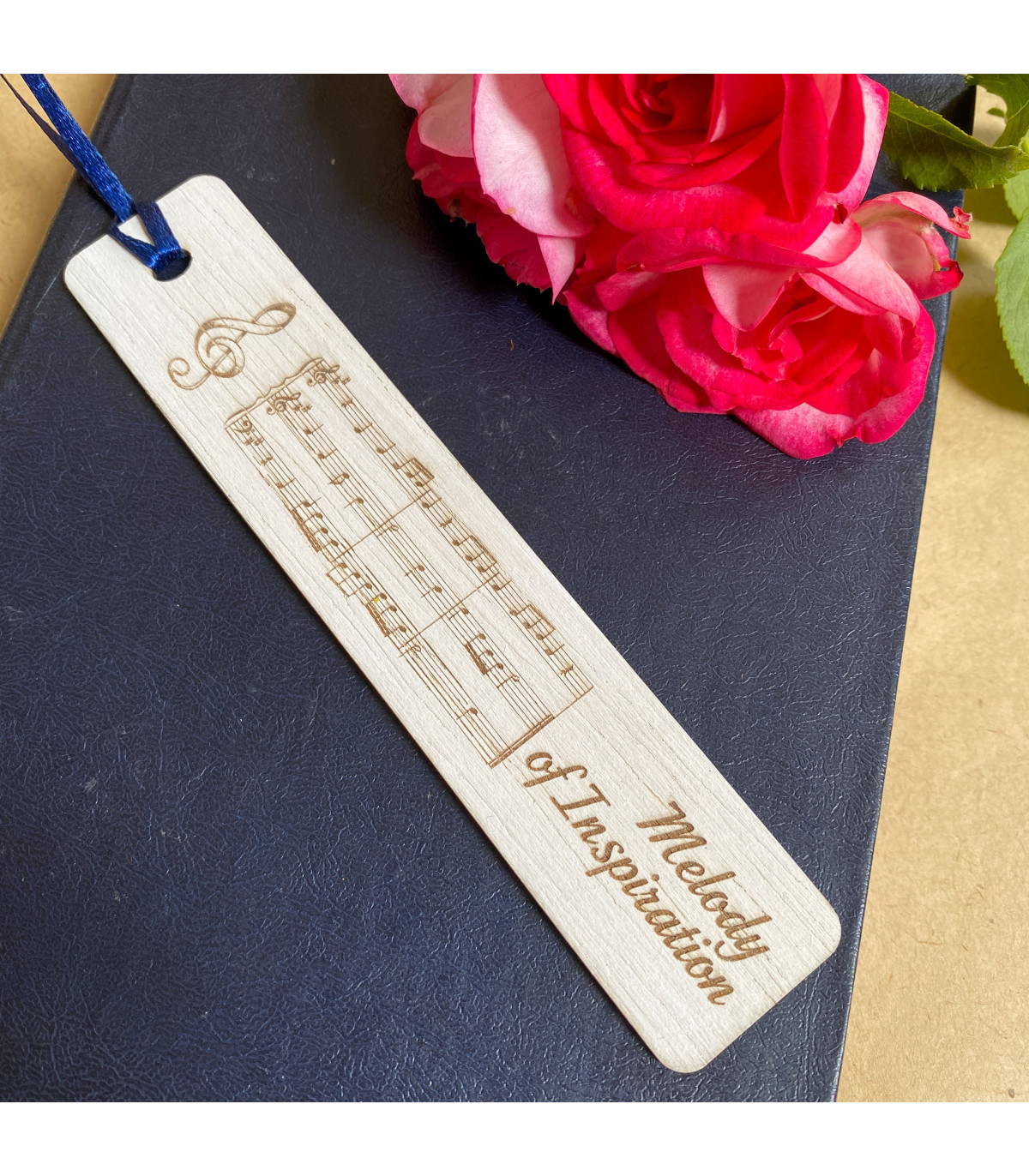 Ця оригінальна закладка виготовлена з натурального дерева та прикрашена лазерним гравіюванням у вигляді нотного стану, скрипкового ключа та надпису «Melody of Inspiration».